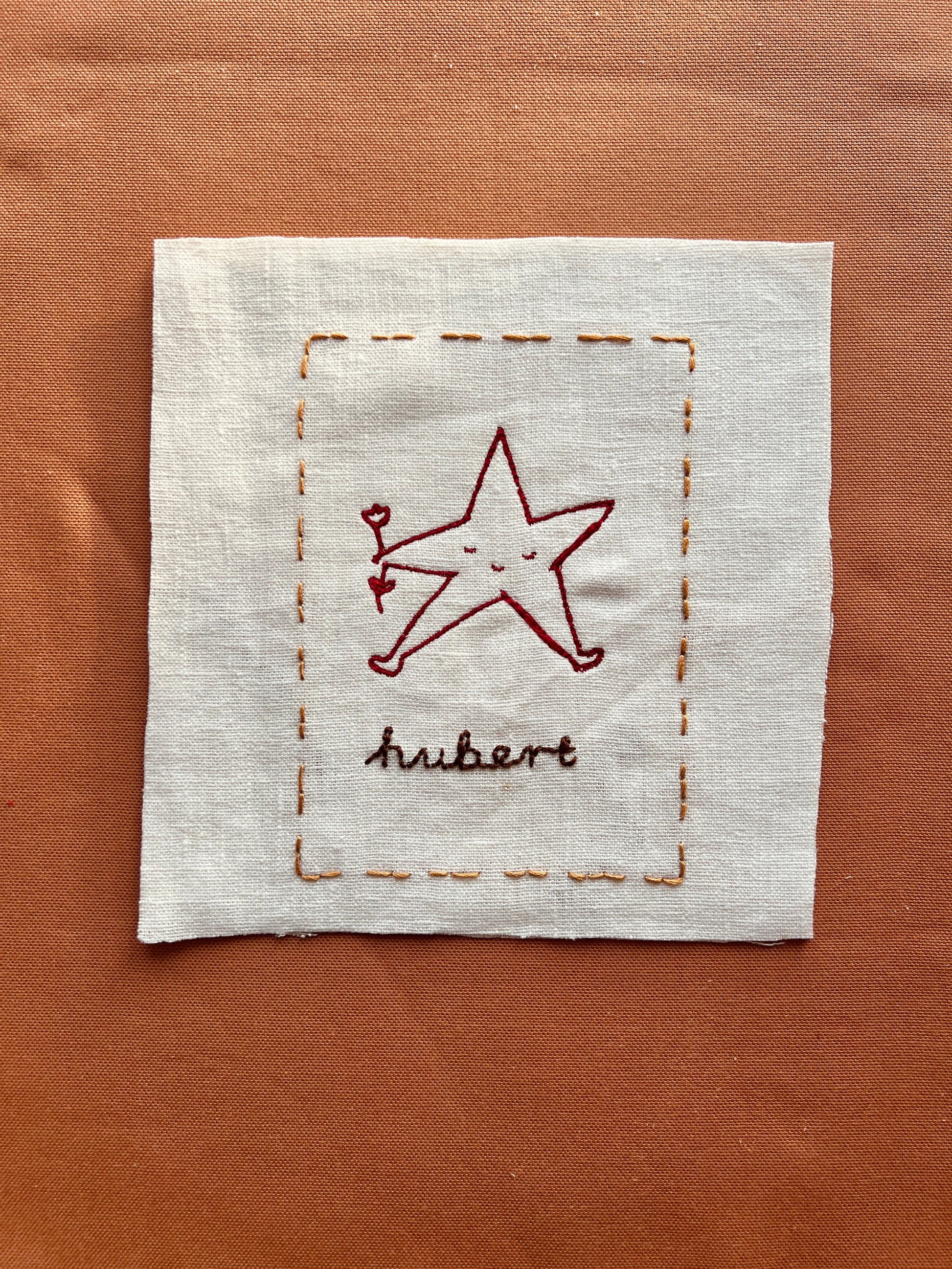 Det broderede navn er en integreret del af designet og kan ses eksemplificeret på produktbilledet med navnet “Hubert”.