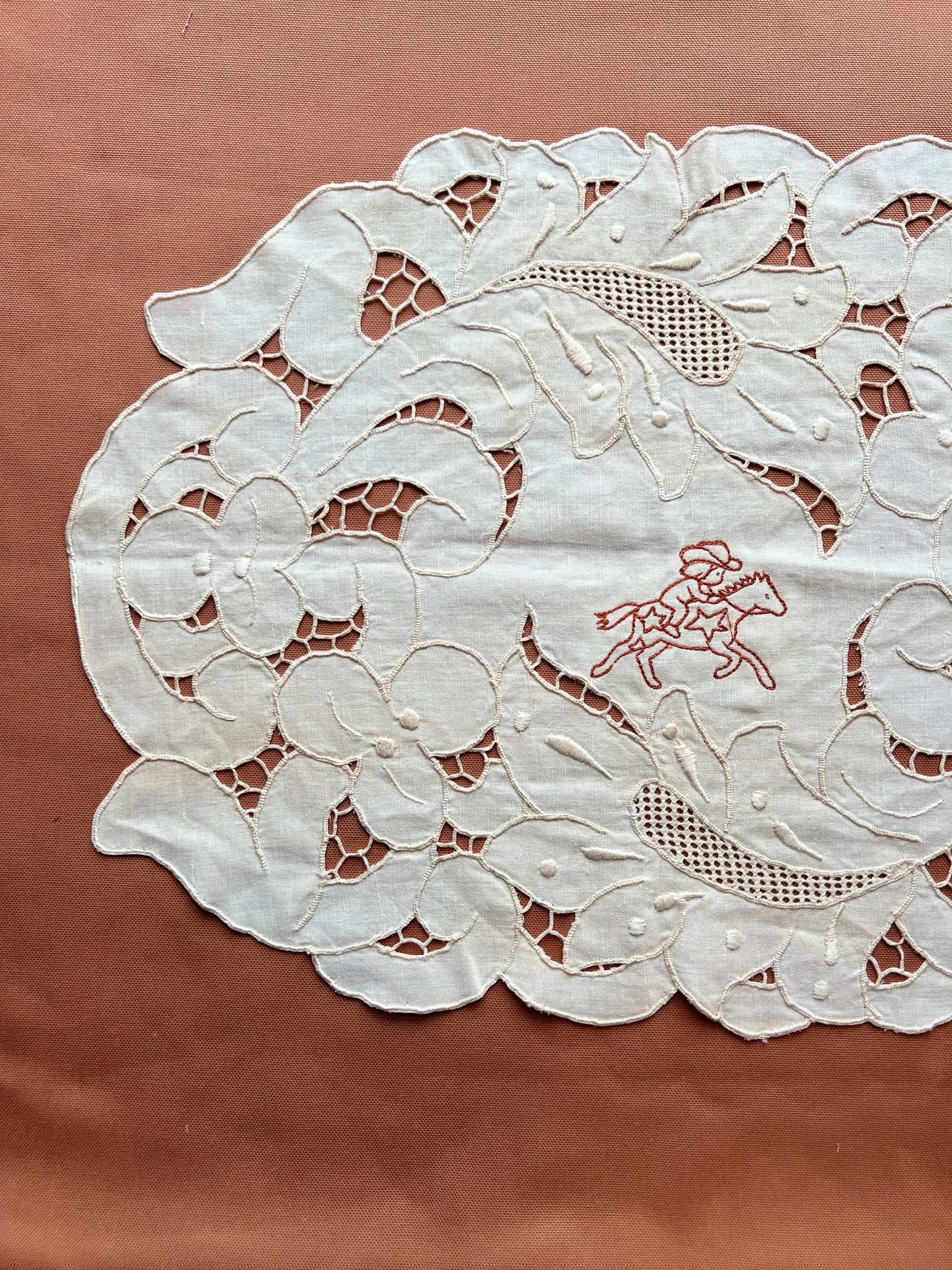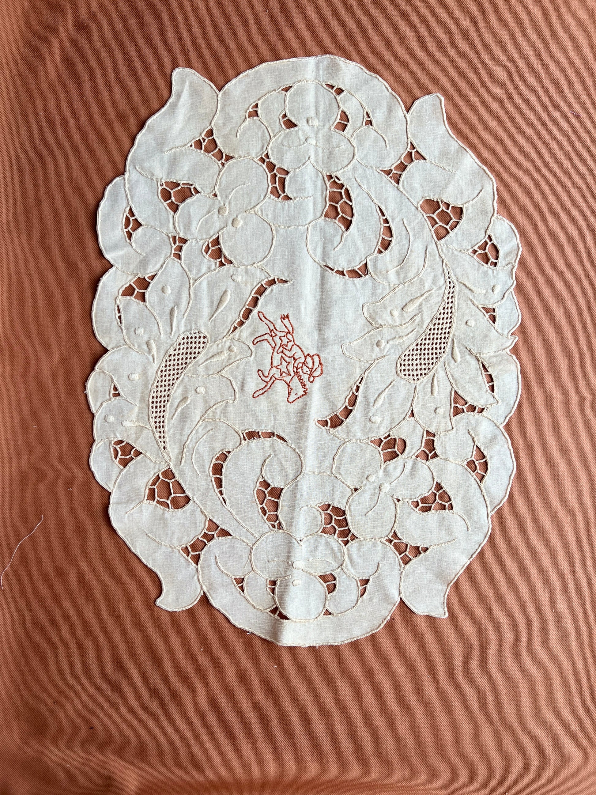 Obs. Dette er et vintage tekstil og kan derfor vise spor af tidligere brug, alder og patina. Mindre uregelmæssigheder, farvevariationer eller tegn på slid er en naturlig del af tekstilets historie og betragtes ikke som fejl, men som en del af dets karakter.