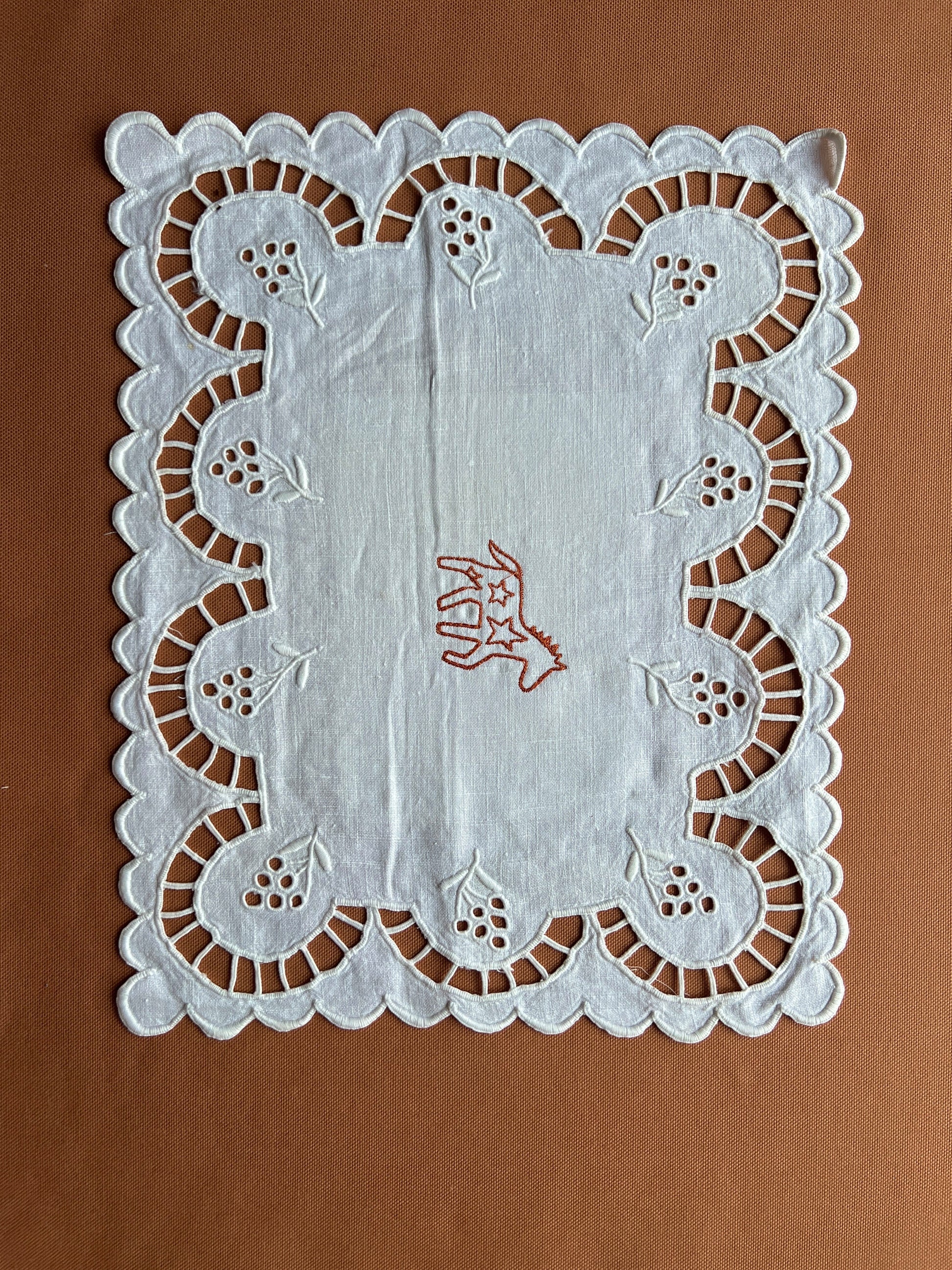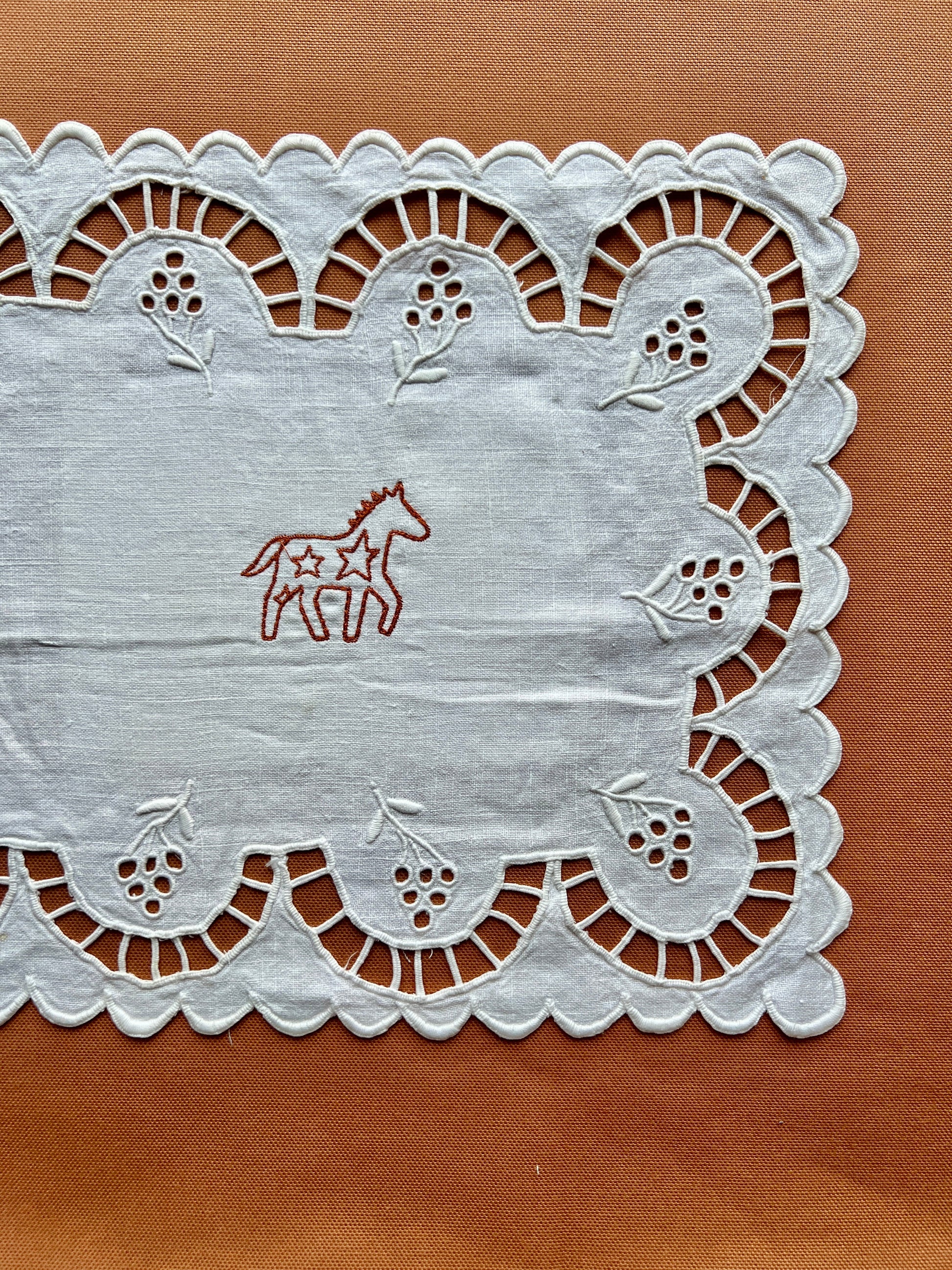 Nøje udvalgte vintage tekstiler med broderede motiver. Hvert stykke findes kun i ét eksemplar og broderes specifikt til den person, det er tiltænkt ved at tilføje håndbroderet navn, dato eller anden tekst