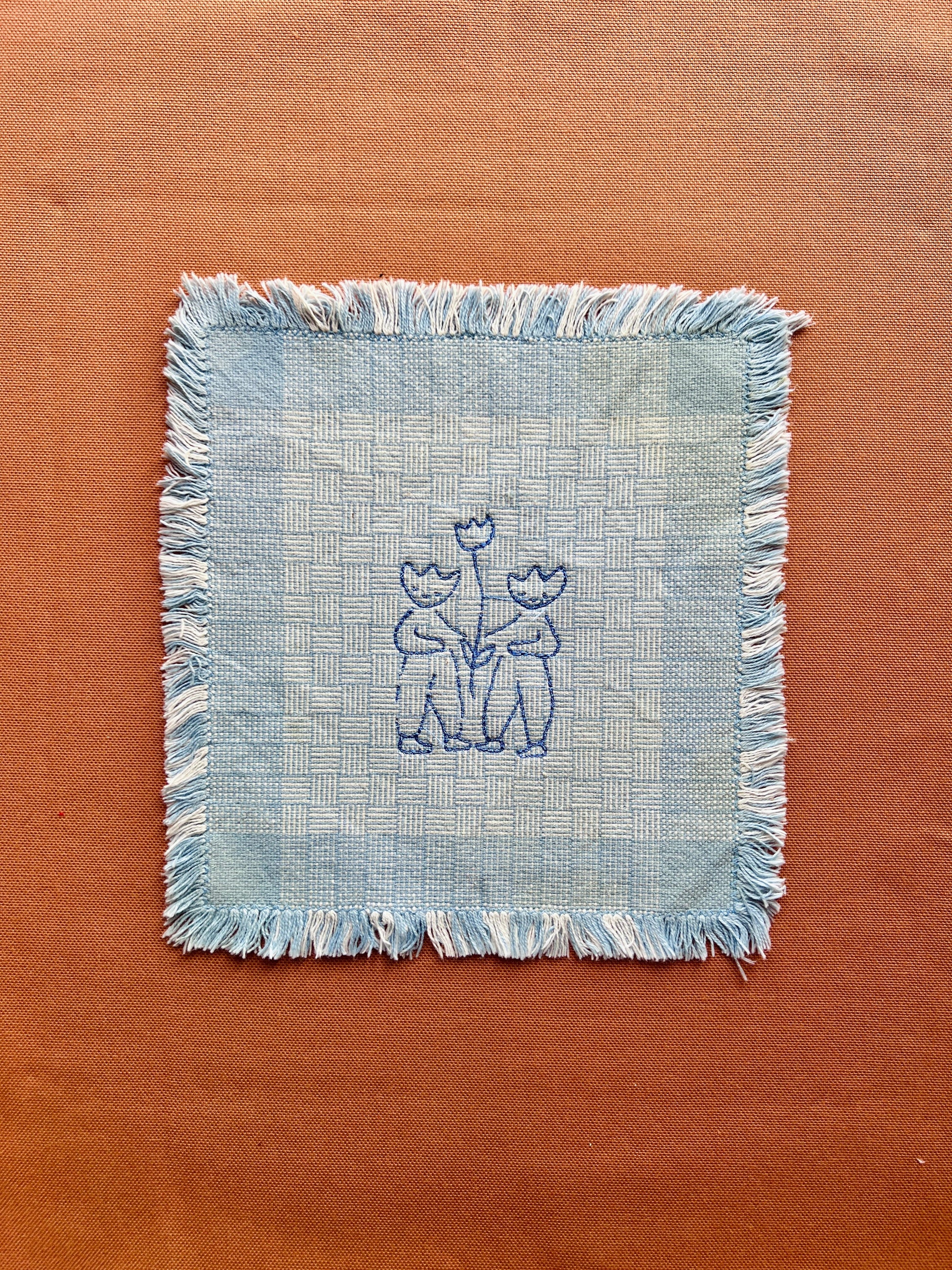 Nøje udvalgte vintage tekstiler med broderede motiver. Hvert stykke findes kun i ét eksemplar og broderes specifikt til den person, det er tiltænkt ved at tilføje håndbroderet navn, dato eller anden tekst