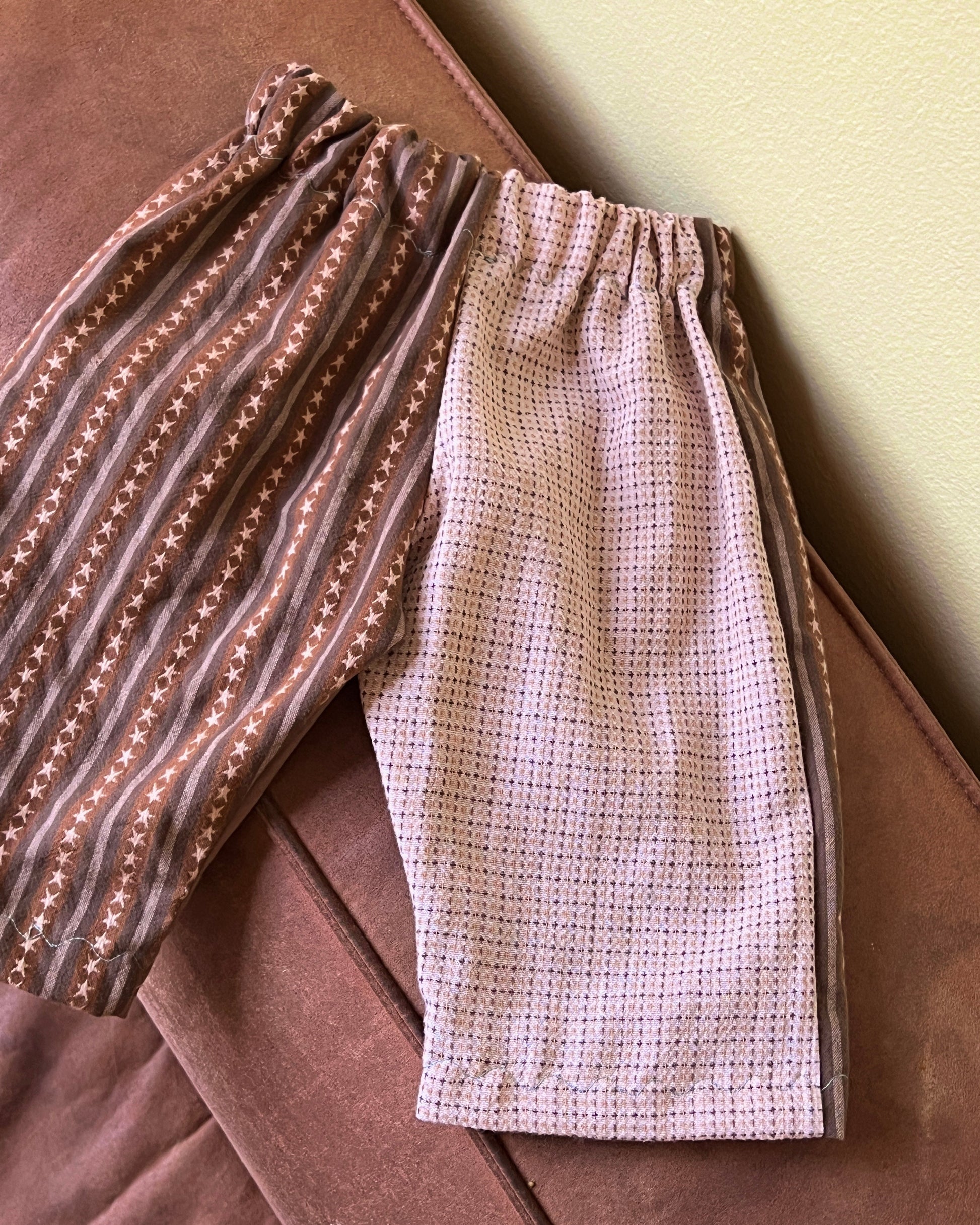 Hver buks er unik – syet i små serier af genbrugte materialer, der får nyt liv i form af komfortable og slidstærke bukser til leg og hverdag.