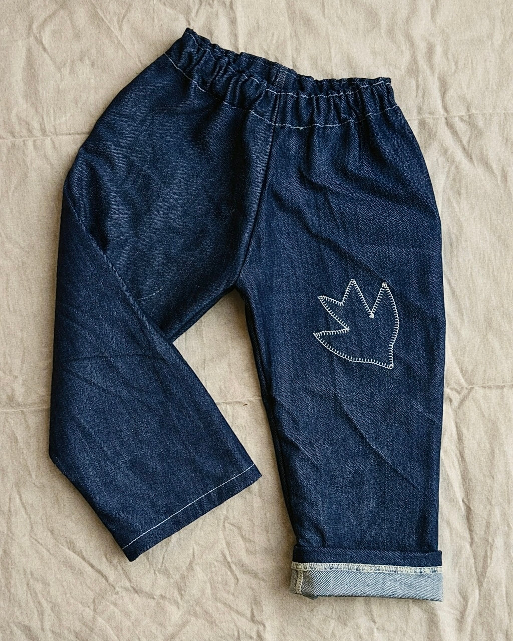 Bukserne har en løs, rummelig pasform med god bevægelsesfrihed og en rå kant i opsmøget, som vi bevidst har beholdt. Det giver bukserne karakter og giver mere plads at vokse i uden at blive for tunge.