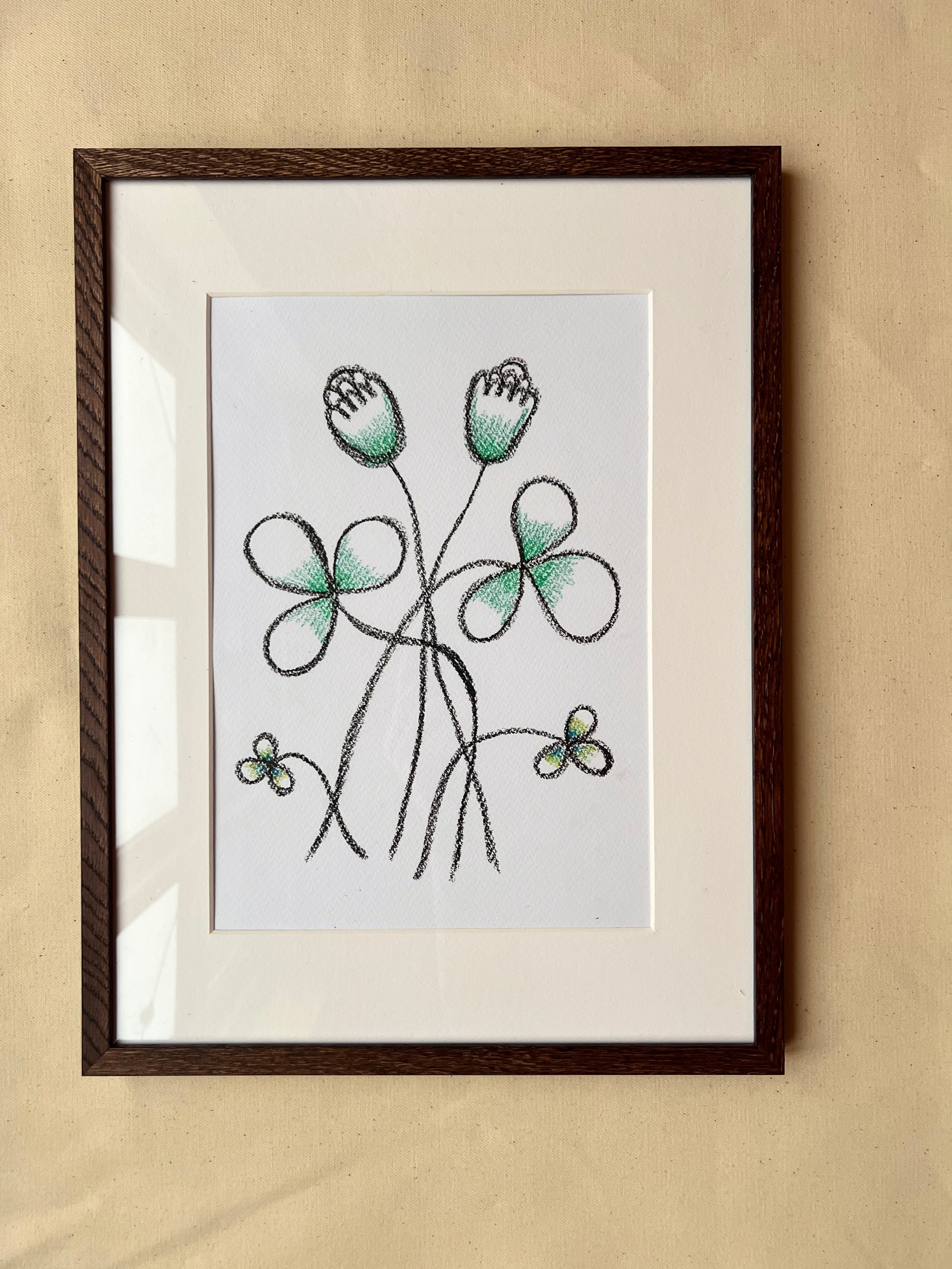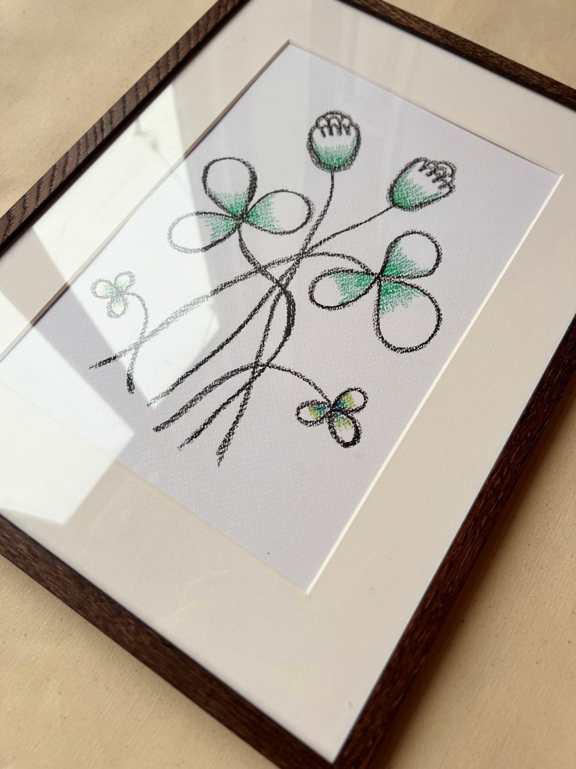 Farverne fremstår bløde og mættede med synlige spor af den håndtegnede proces. Variationer i farvelag og intensitet er en del af udtrykket og vidner om materialets karakter.