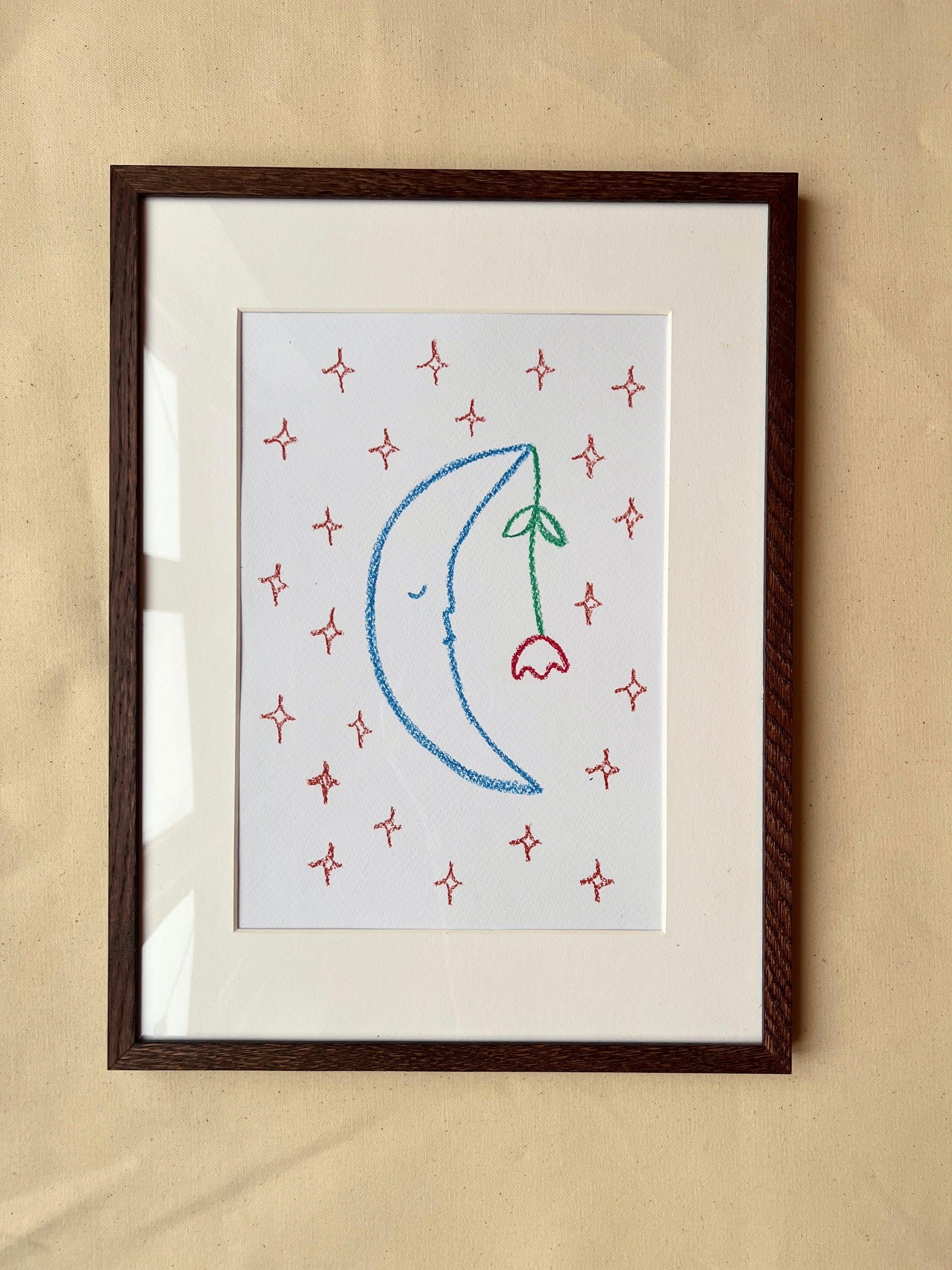Tegning udført i hånden med bivoksfarver og efterfølgende professionelt scannet og trykt for at bevare farvernes dybde, lag og det oprindelige udtryk så præcist som muligt.