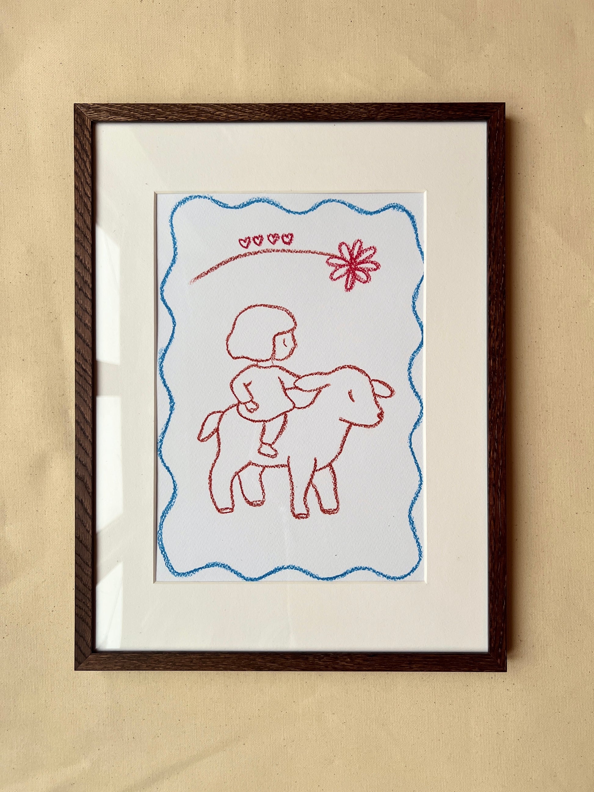 Tegning udført i hånden med bivoksfarver og efterfølgende professionelt scannet og trykt for at bevare farvernes dybde, lag og det oprindelige udtryk så præcist som muligt.
