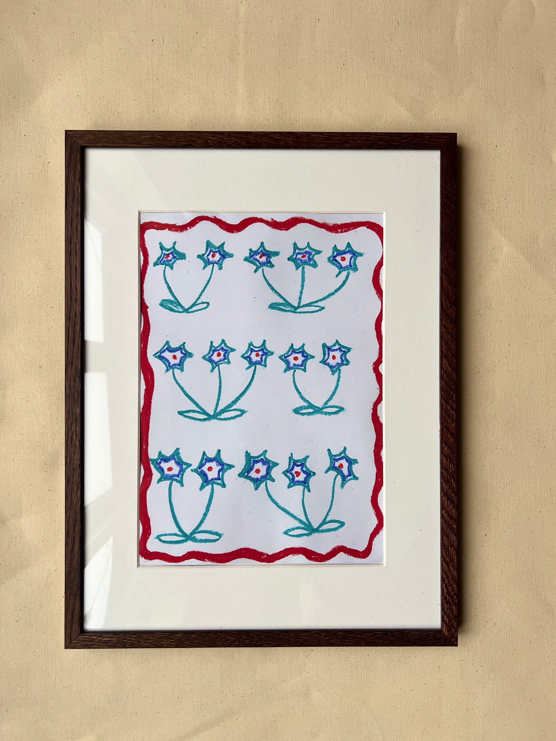 Denne tegning er udført i hånden med oliekridt og efterfølgende professionelt scannet og trykt for at bevare farvernes dybde, lag og det oprindelige udtryk så præcist som muligt.