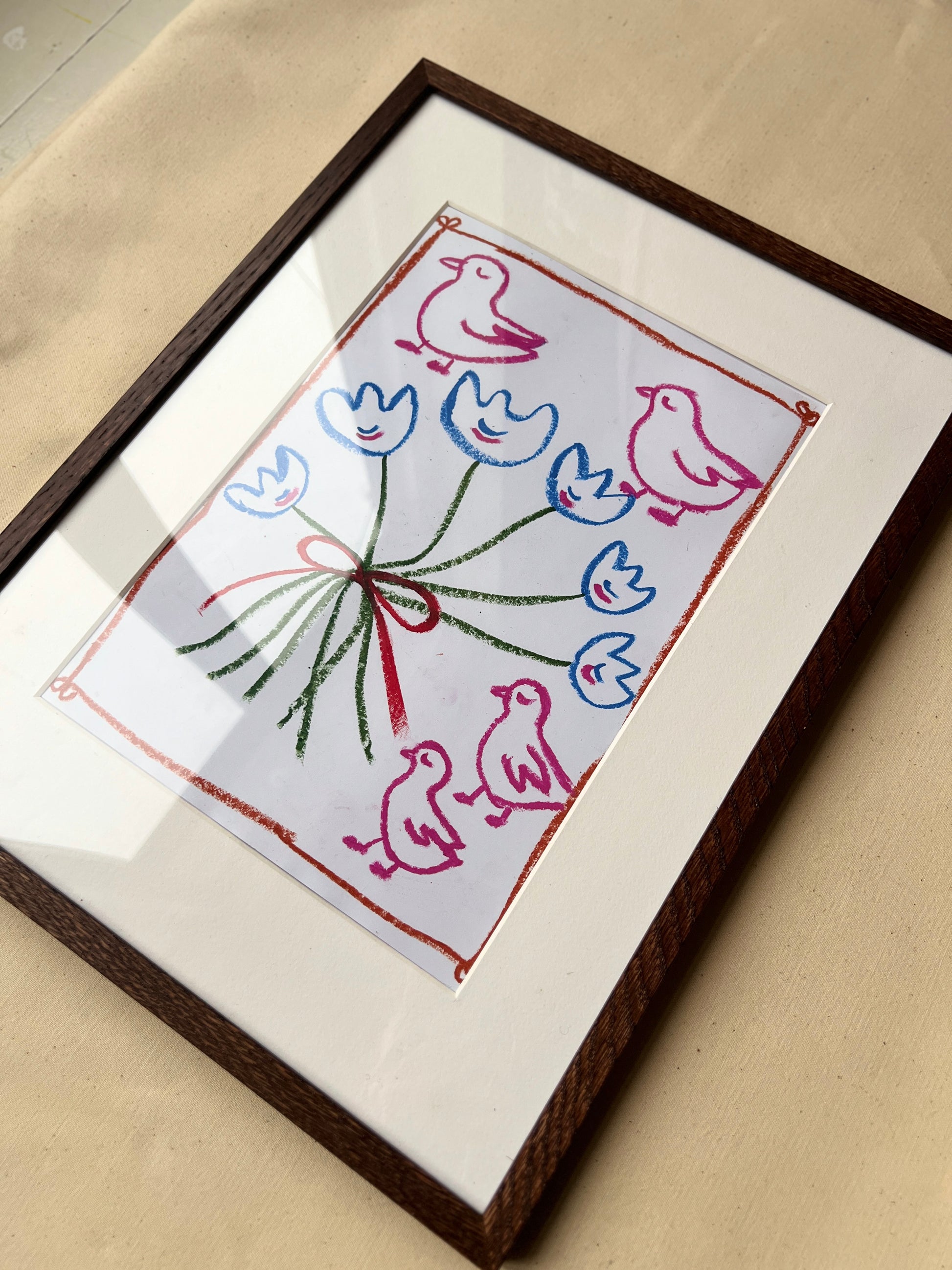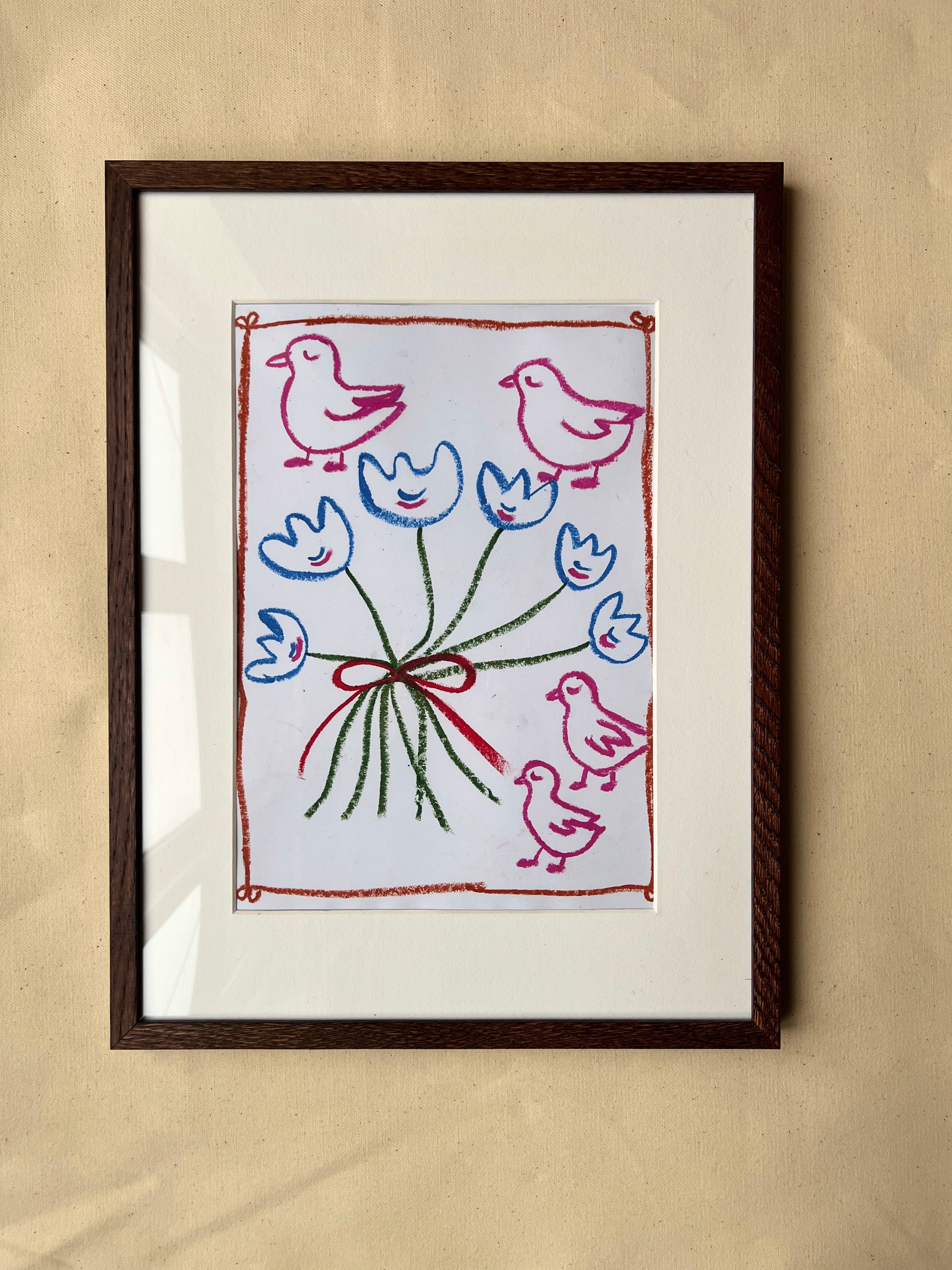Denne tegning er udført i hånden med oliekridt og efterfølgende professionelt scannet og trykt for at bevare farvernes dybde, lag og det oprindelige udtryk så præcist som muligt.