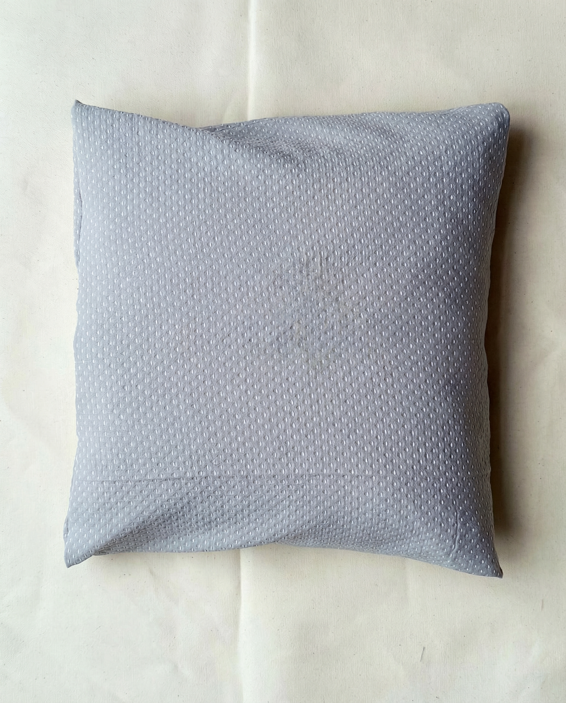 Pudebetrækket kan købes uden pude eller sammen med en monteringspude i økologisk bomuld, fyldt med andefjer, som giver god fylde og holder formen over tid.