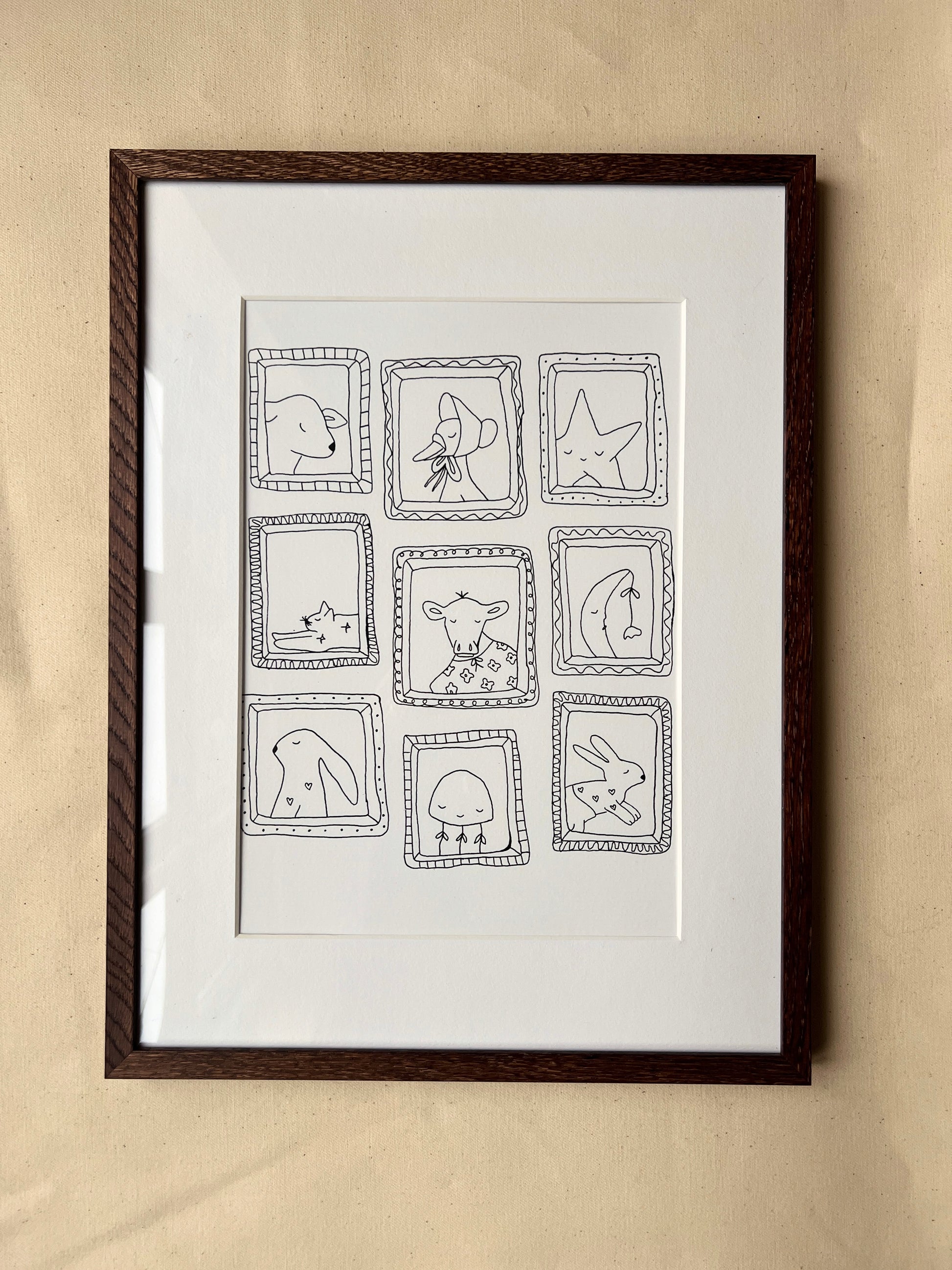 Trykket er produceret på 275 g tydeligt struktureret papir i en let knækket hvid tone. Papiret er ikke glat, men har en synlig og mærkbar overflade, der ligger tæt op ad det originale tegnepapir og understøtter det analoge udgangspunkt uden at tilføje nye visuelle elementer.