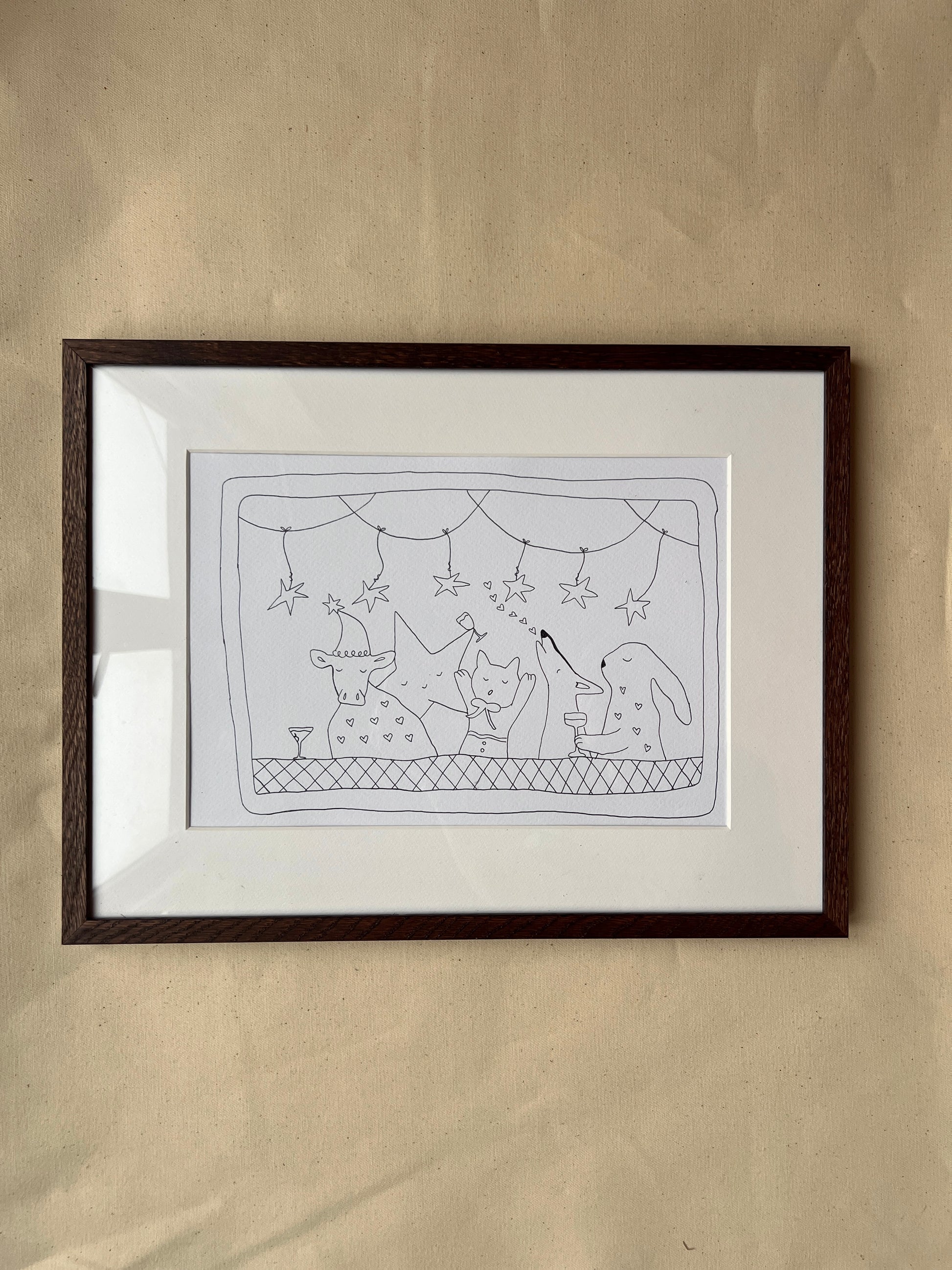 Håndtegnet stregtegning, efterfølgende professionelt scannet og trykt.