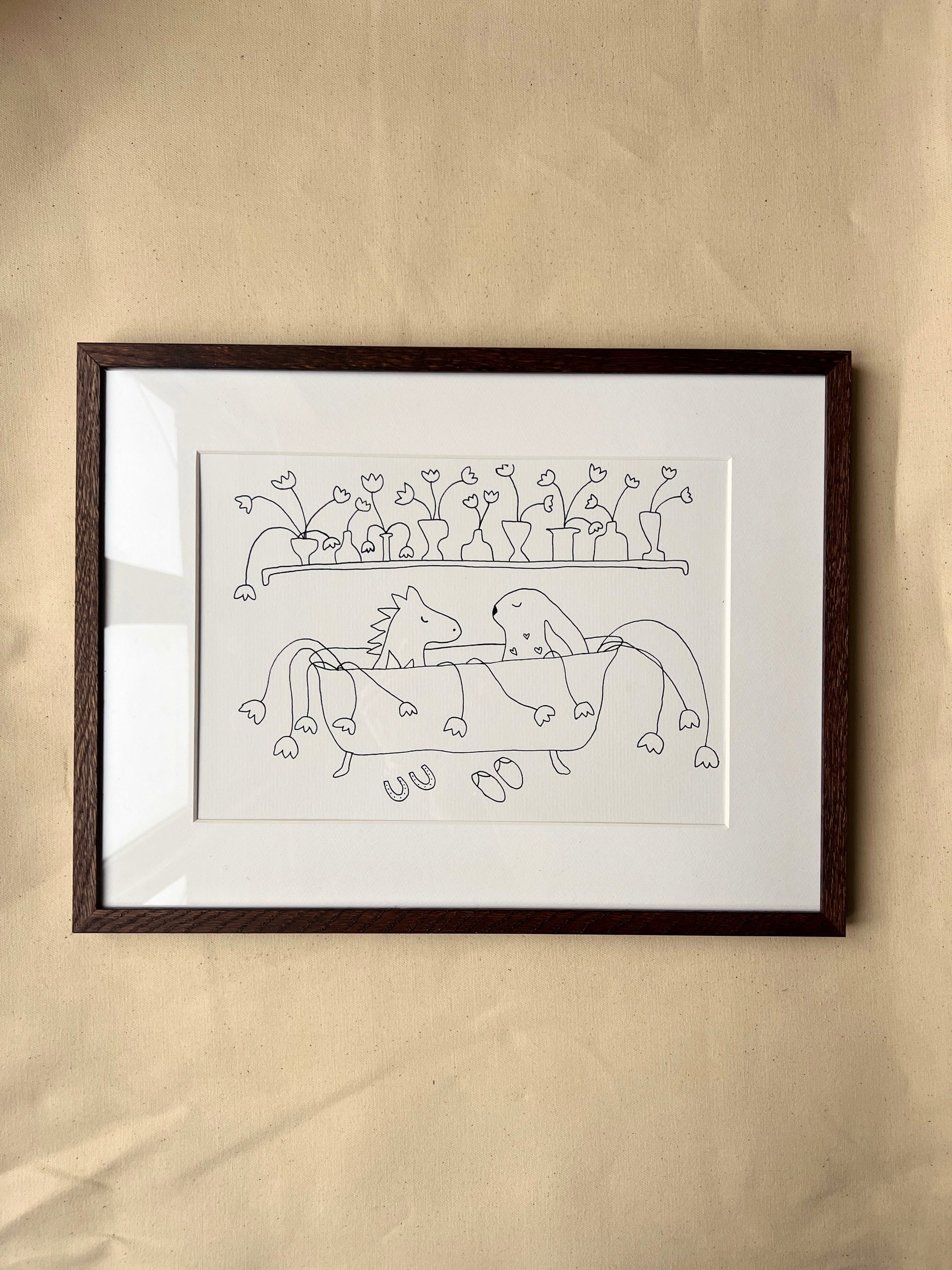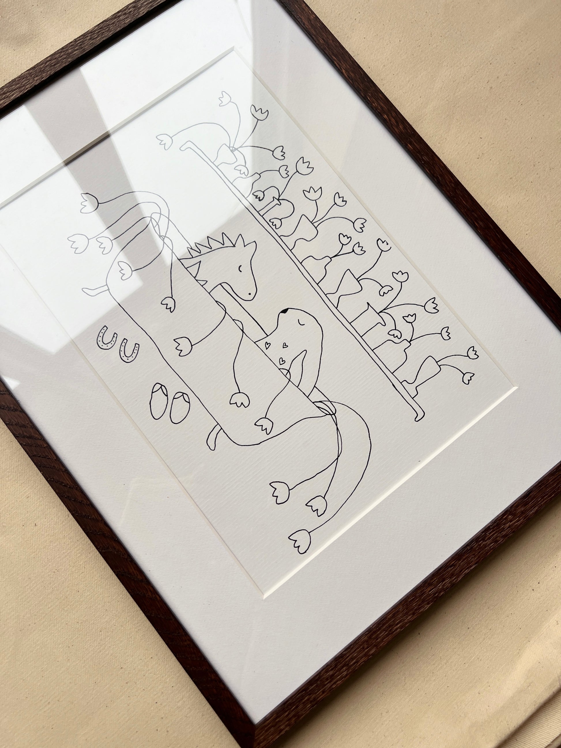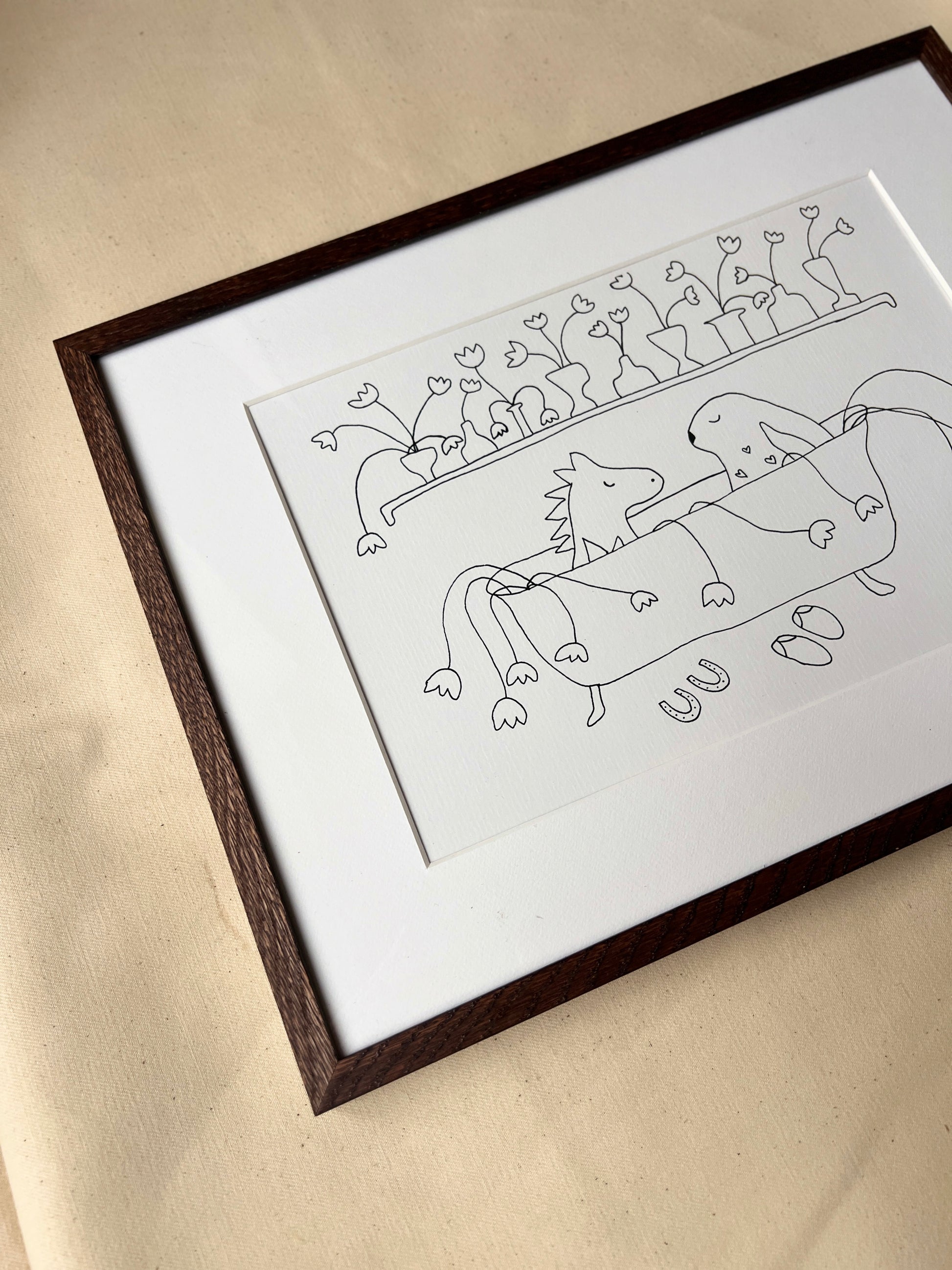 Håndtegnet stregtegning, efterfølgende professionelt scannet og trykt.
