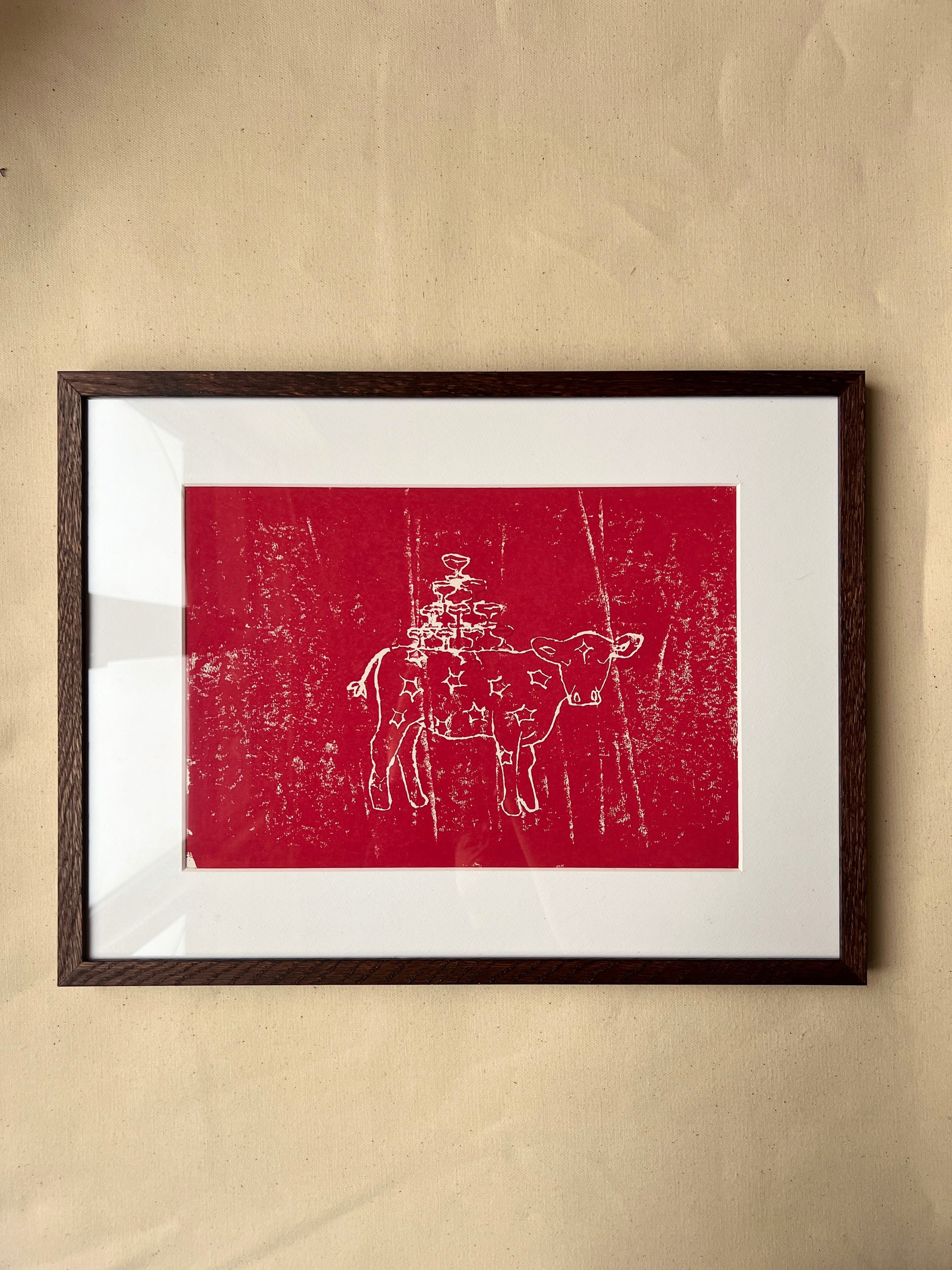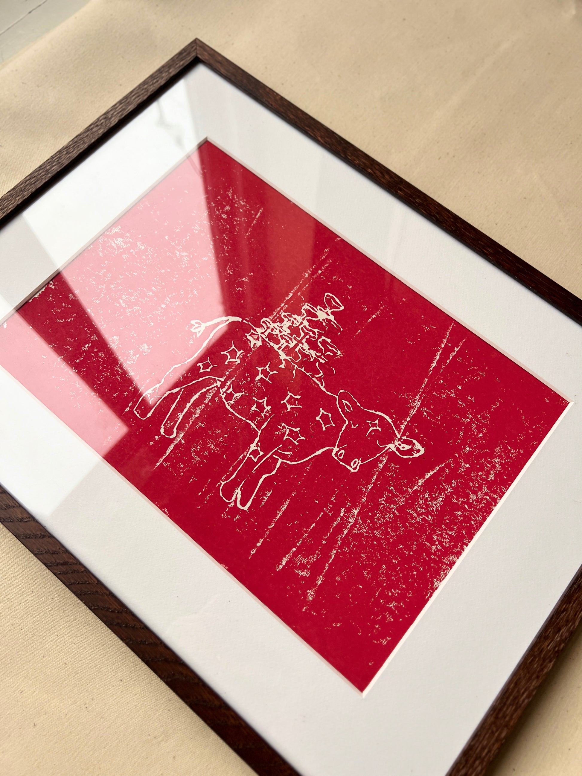 Dette motiv er oprindeligt skabt som linoleumstryk og efterfølgende professionelt scannet og trykt for at bevare trykkets kontrast, struktur og det håndlavede udtryk så præcist som muligt.