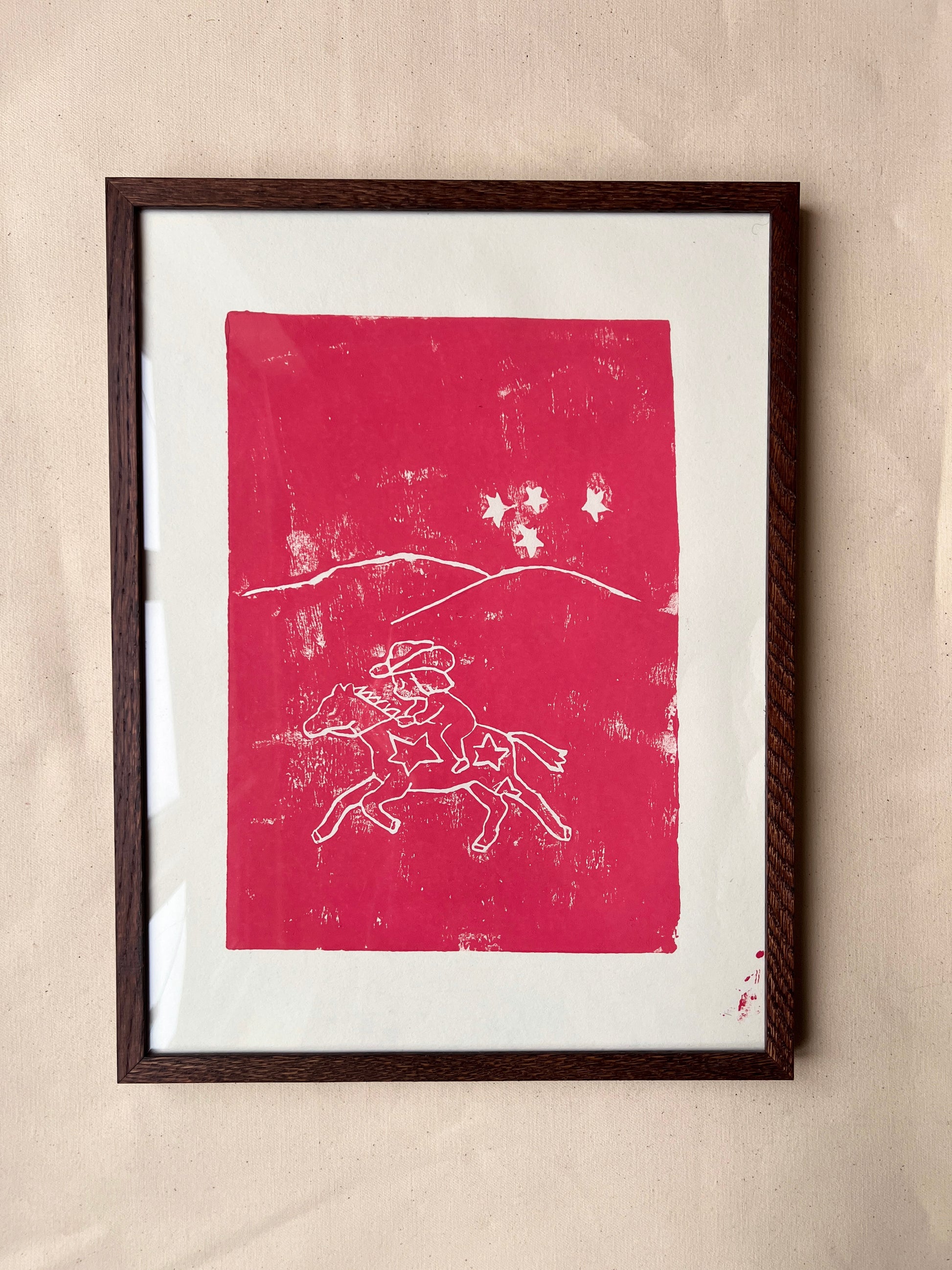 Dette motiv er oprindeligt skabt som linoleumstryk og efterfølgende professionelt scannet og trykt for at bevare trykkets kontrast, struktur og det håndlavede udtryk så præcist som muligt.